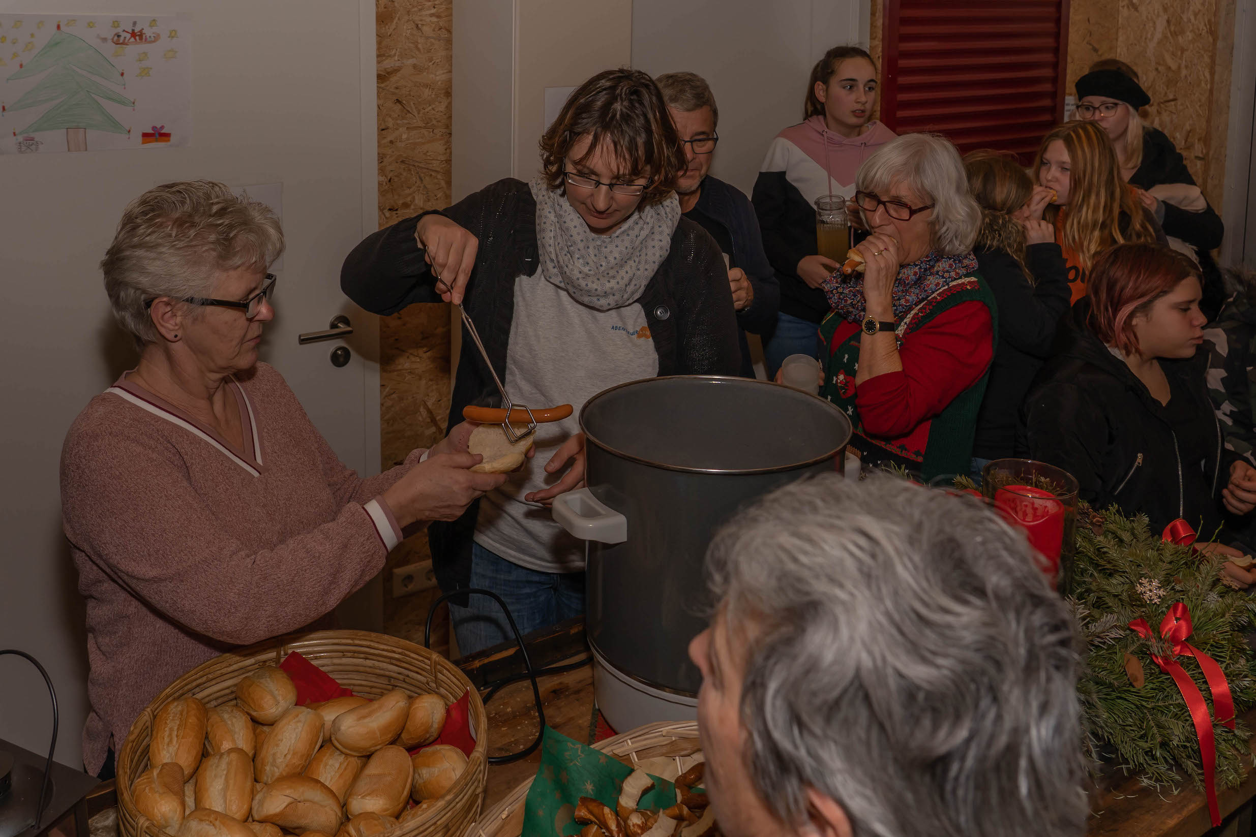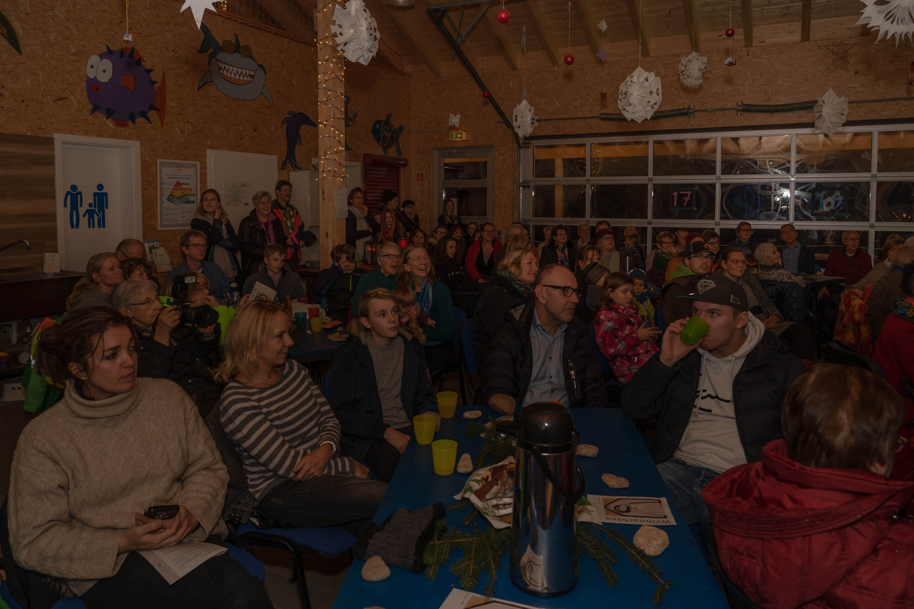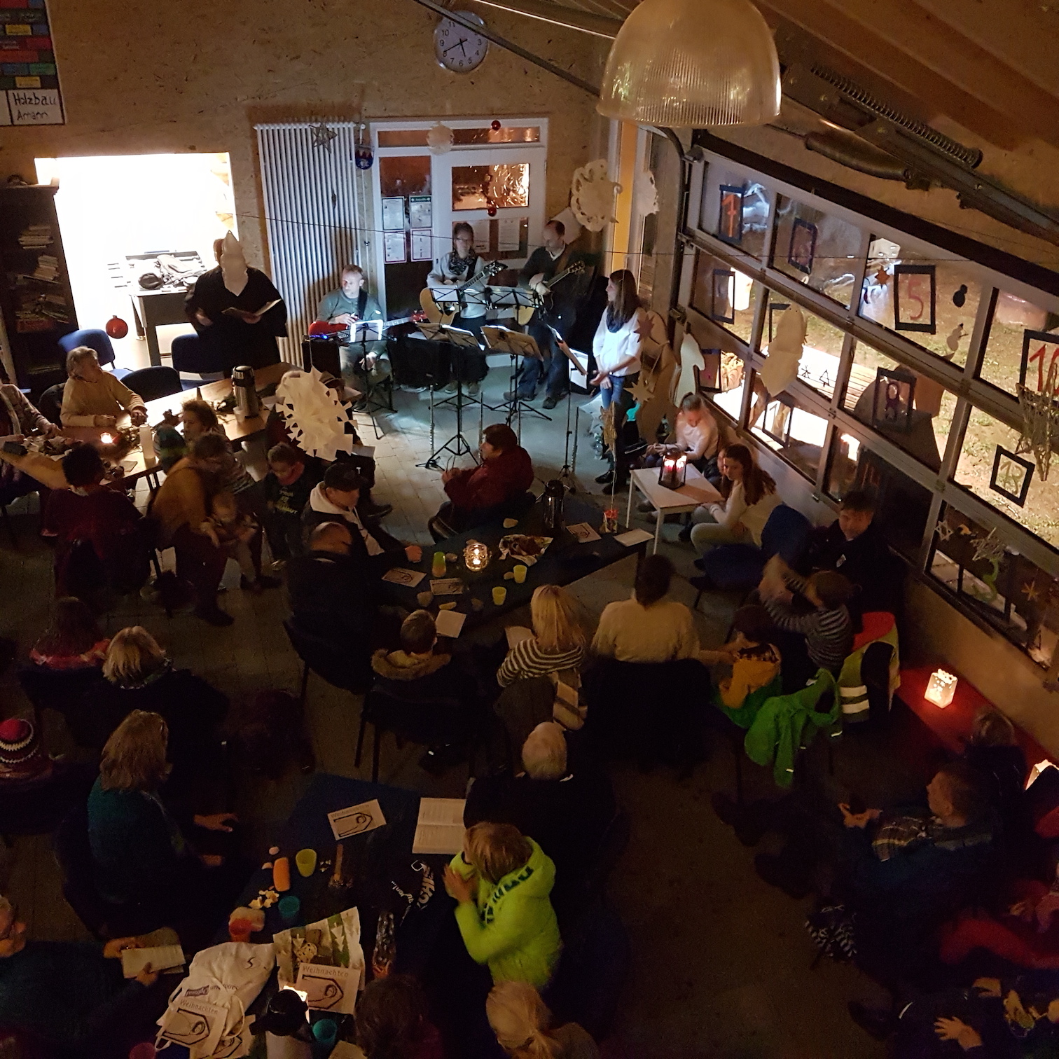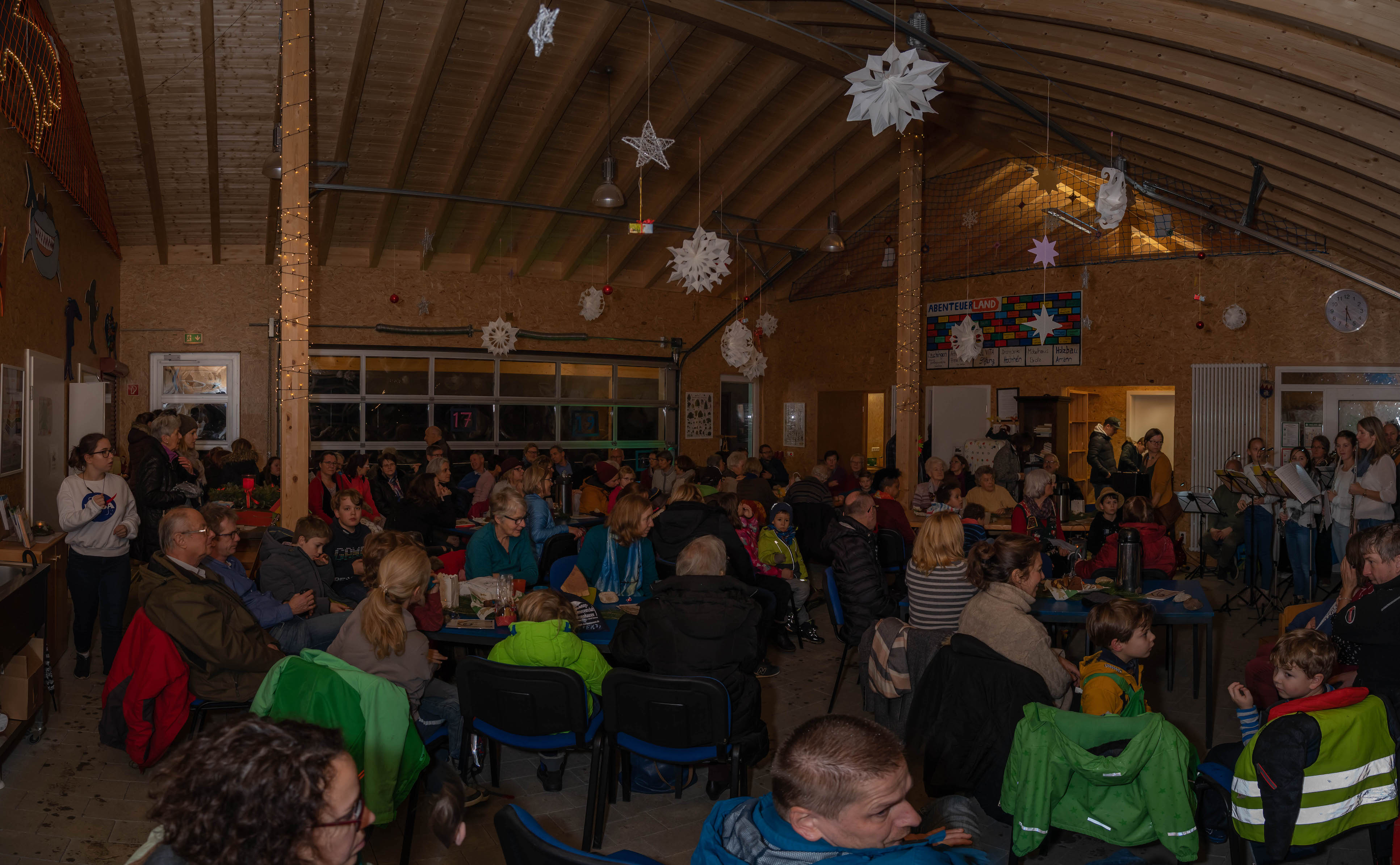Beim “Weg nach Bethlehem” waren wir – wetterbedingt – nur ca. 20-30 Personen, in der Scheune warteten dann allerdings bereits weitere ca. 60 Personen auf uns – eine unbeschreibliche Stimmung: Junge und Alte, alle gutgelaunt und fröhlich. Es wurde gesungen und Musik gemacht, dazu Punsch getrunken, Hot Dogs, Laugen, Lebkuchen und Mandarinen gegessen.