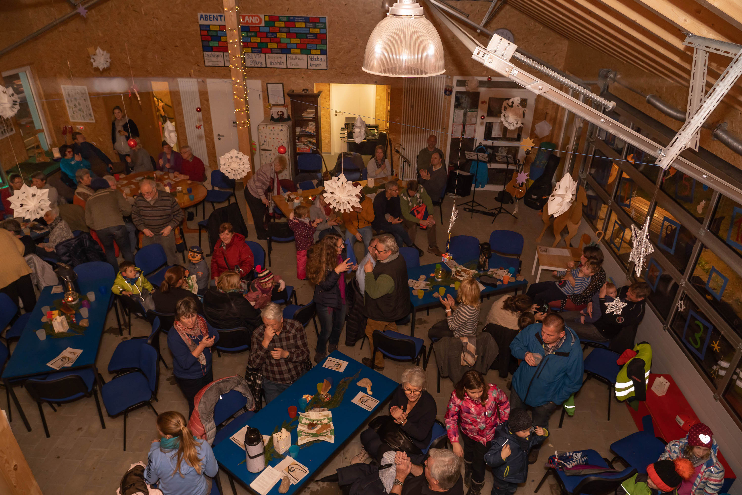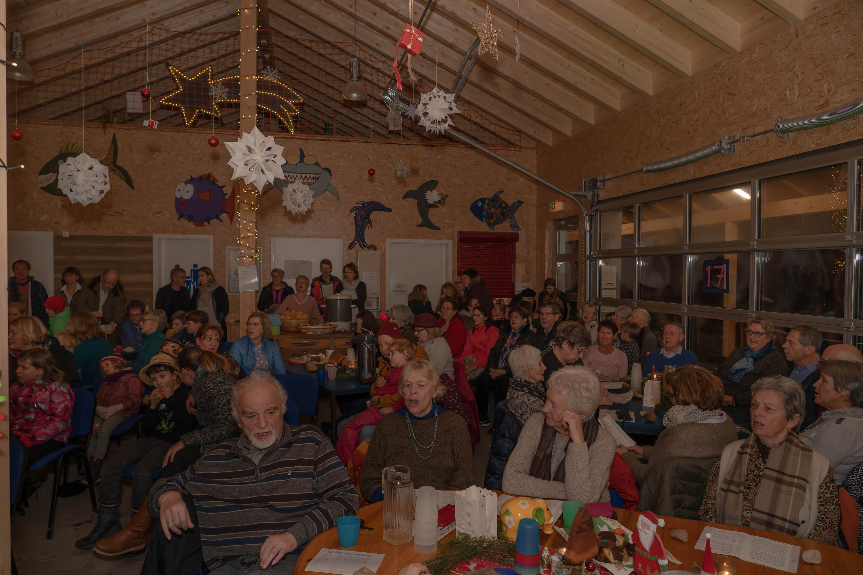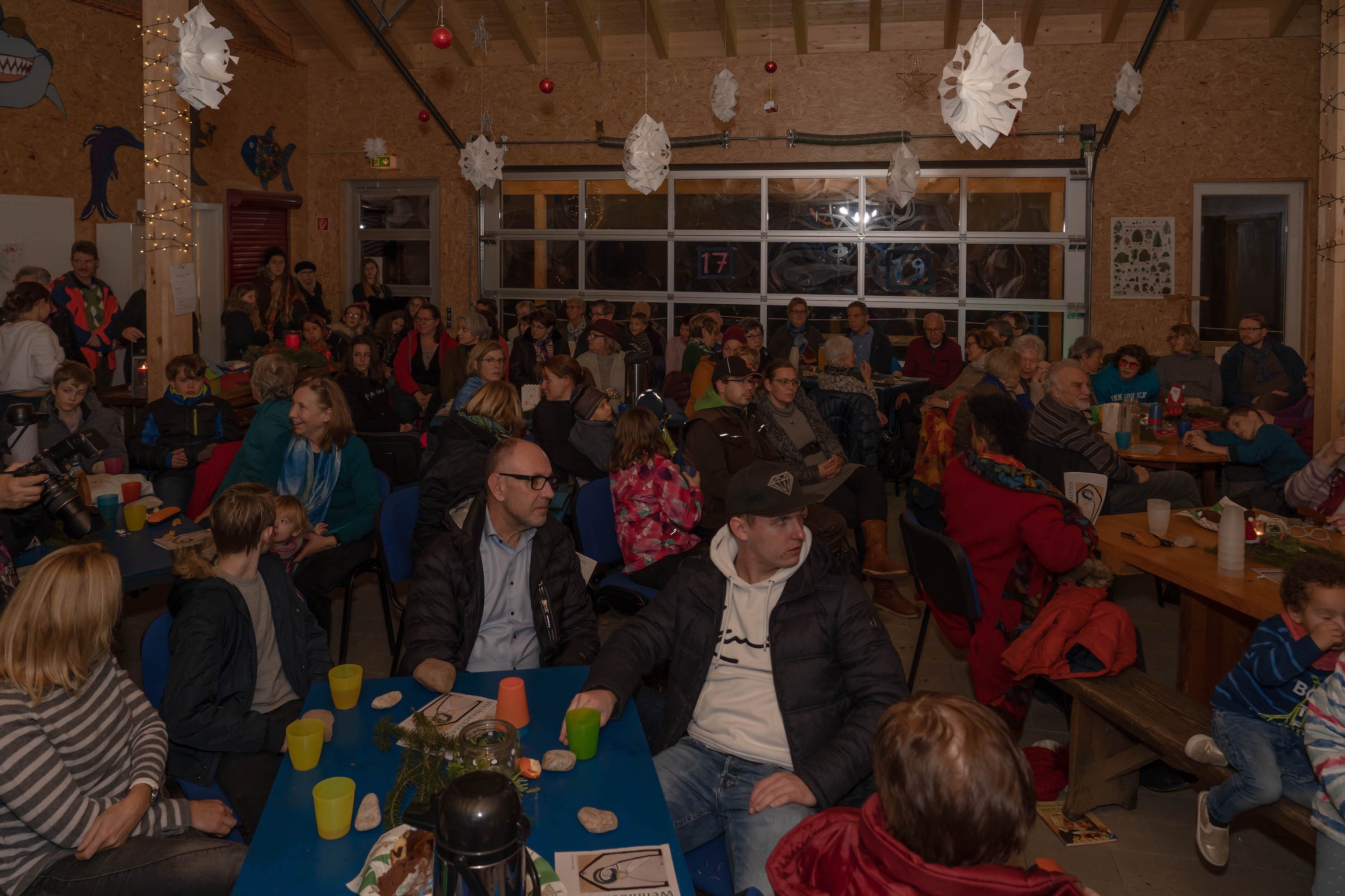 Beim “Weg nach Bethlehem” waren wir – wetterbedingt – nur ca. 20-30 Personen, in der Scheune warteten dann allerdings bereits weitere ca. 60 Personen auf uns – eine unbeschreibliche Stimmung: Junge und Alte, alle gutgelaunt und fröhlich. Es wurde gesungen und Musik gemacht, dazu Punsch getrunken, Hot Dogs, Laugen, Lebkuchen und Mandarinen gegessen.