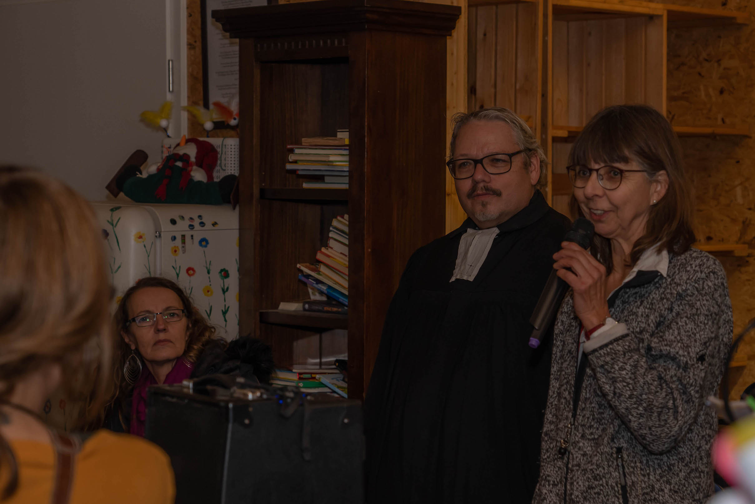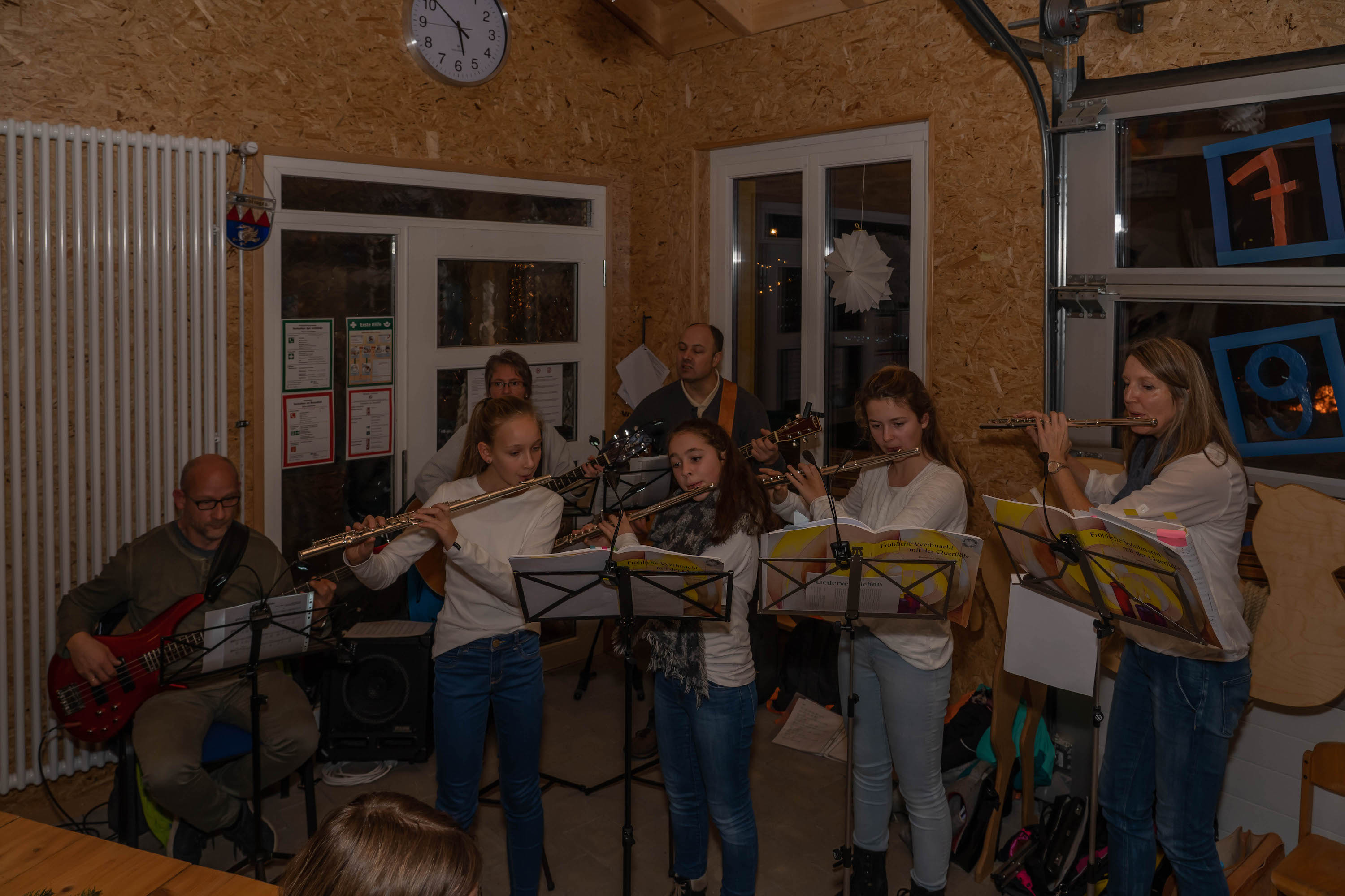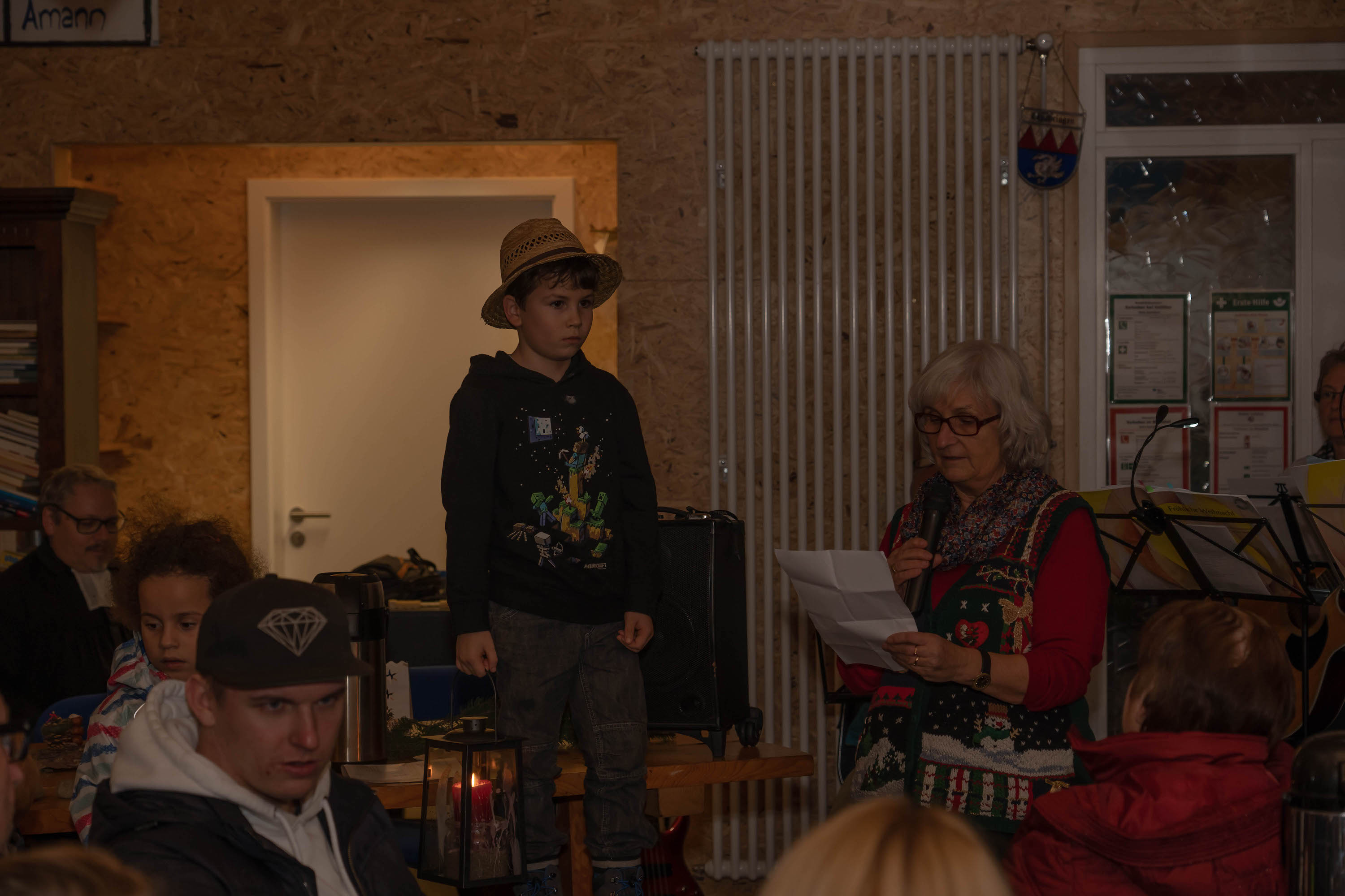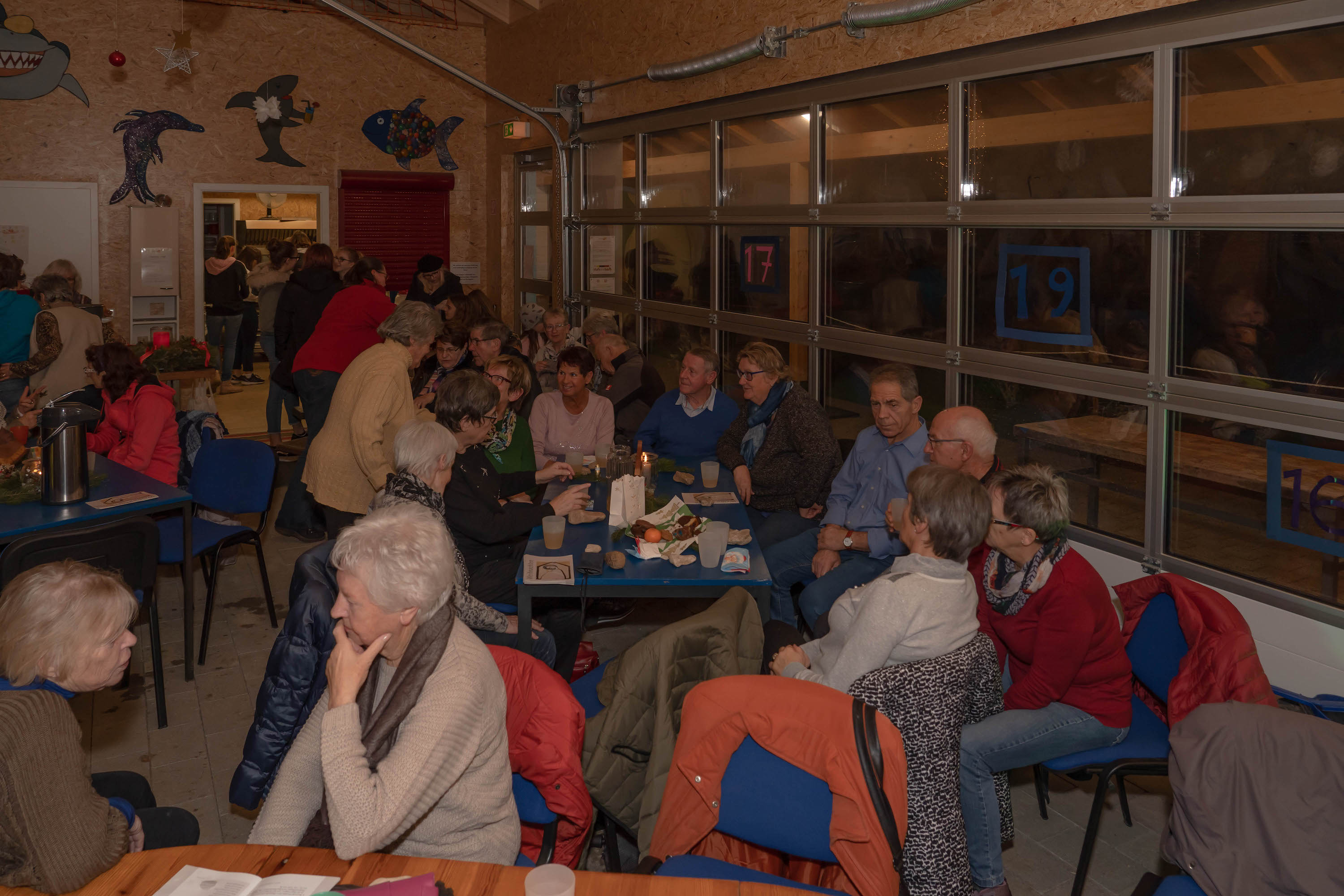 Beim “Weg nach Bethlehem” waren wir – wetterbedingt – nur ca. 20-30 Personen, in der Scheune warteten dann allerdings bereits weitere ca. 60 Personen auf uns – eine unbeschreibliche Stimmung: Junge und Alte, alle gutgelaunt und fröhlich. Es wurde gesungen und Musik gemacht, dazu Punsch getrunken, Hot Dogs, Laugen, Lebkuchen und Mandarinen gegessen.
