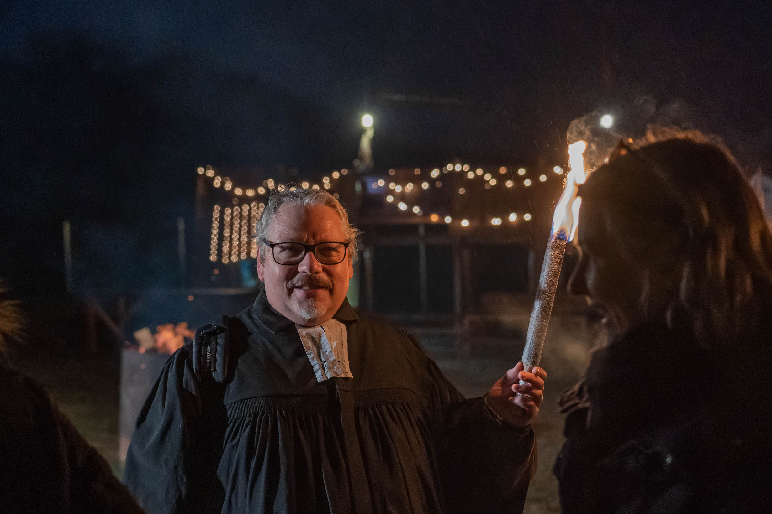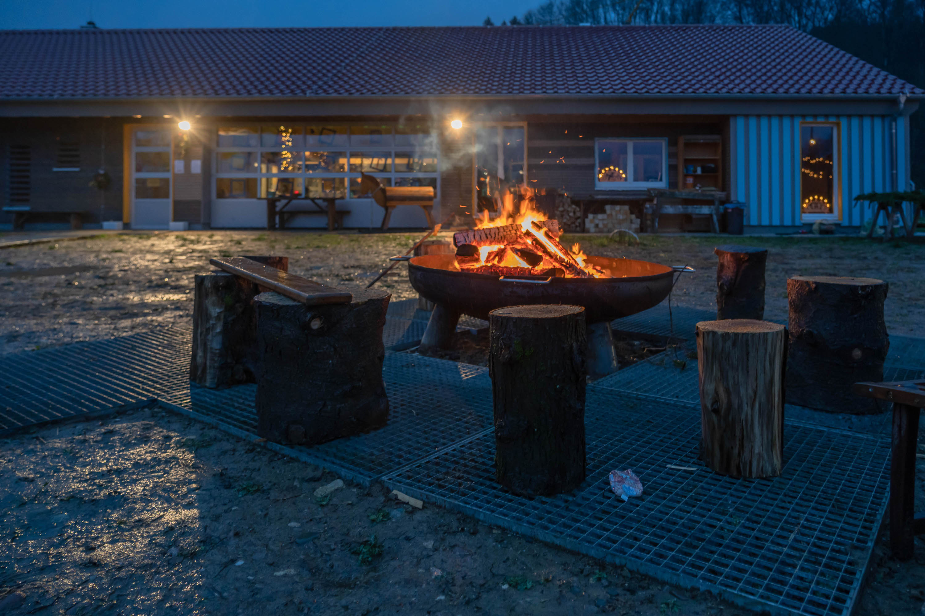 Andreas und Andrea hatten das Außengelände wunderschön beleuchtet, die große Feuerstelle und die Feuertonnen brannten. Innen gab es Licht durch Lichterketten und viele Kerzen. Der Adventsschmuck in der Halle ließ ein bißchen vergessen, dass wir in einer Scheune waren.
