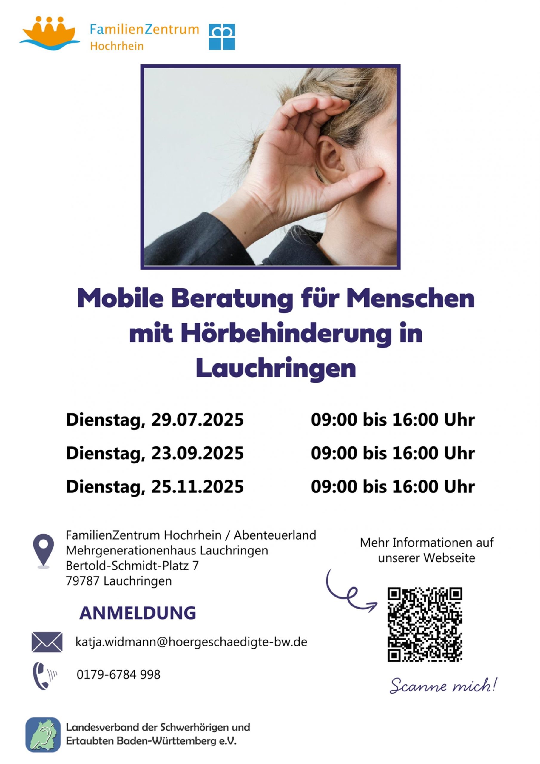 Mobile Beratung für Menschen mit Hörbehinderung 24. März 2026 Kommentieren Am 27.03.2026 von 8:30 — 14:00 Uhr findet der nächste Beratungstermin im Familienzentrum Hochrhein statt. Hörberatung